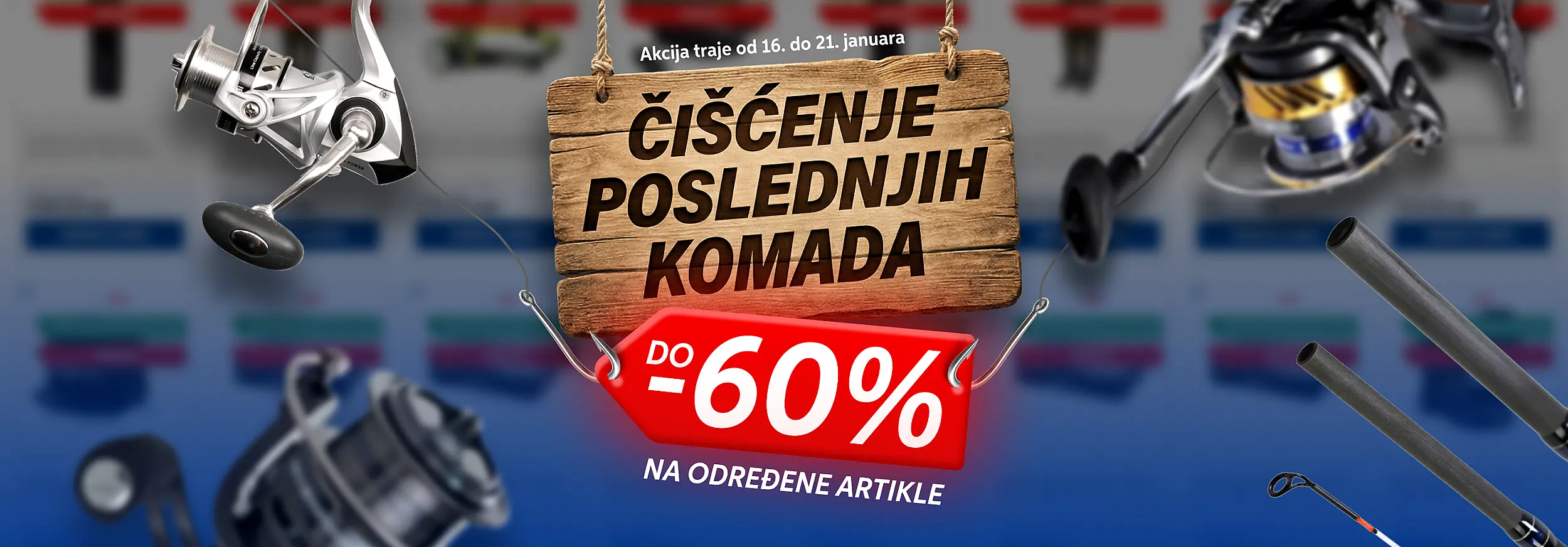 U ponudi imamo široki asortiman opreme za pecanje (štapovi za pecanje, mašinice za pecanje, mamci, varalice, udice, kamp oprema i još mnogo toga).
