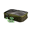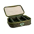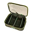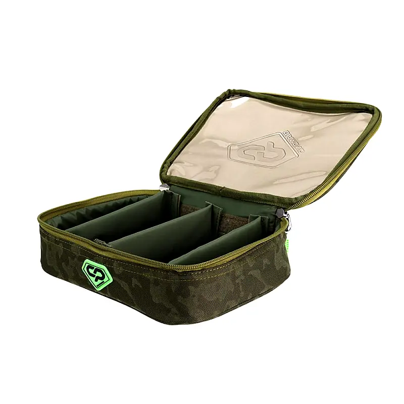 Unutrašnji prostor torbice opremljen je sa dve pregrade na čičak trake koje se mogu pomerati ili potpuno ukloniti. To vam omogućava da sami kreirate raspored i veličinu pregrada prema potrebama vašeg pribora. Zidovi torbice su tapacirani mekim, poroznim materijalom koji amortizuje udarce, štiteći osetljive predmete poput elektronskih indikatora, baterija ili bočica sa dipovima. Napravljena je od visokokvalitetnog Oxford 650D materijala, koji je vodootporan i izuzetno otporan na habanje. Torbica dolazi u prepoznatljivom Diamond kamuflažnom (camo) dezenu. Opremljena je pouzdanim dvosmernim rajsferšlusom sa ergonomskim gumiranim zatezačima. Na gornjem delu se nalazi čvrsta ručka za nošenje obložena EVA penom za udobnije rukovanje. Savršena za odlaganje kutija sa udicama, PVA materijala, igala, makaza, markera ili rezervnih baterija.