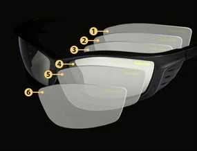 - 1 višeslojni sa anti-reflex sloj (5) koji apsorbuje svetlost i sprečava da se svetlost odbija od zadnjeg dela stakla u oko, eliminišući povratnu refleksiju