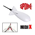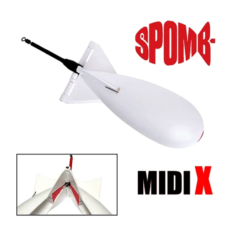 Midi X Spomb je inovativna raketa za hranjenje dizajnirana za postizanje ekstremnih daljina zabačaja uz visoku preciznost, efikasno rešavajući problem hranjenja udaljenih pozicija na vodi. Ova raketa je veličinom pozicionirana tačno između standardnog Midi i Large Spomba, kombinujući aerodinamične karakteristike manjeg modela sa povećanim kapacitetom. Oblik Midi X modela je posebno poboljšan sa težištem pomerenim napred (weight forward design), što značajno poboljšava stabilnost u letu i omogućava zabačaje na veće udaljenosti, čak i pri vetrovitim uslovima.